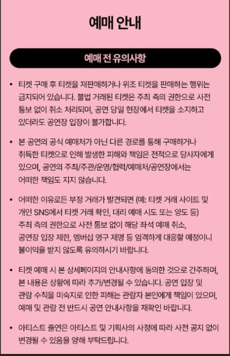 | 예매 시작 10분 전 대기 | PC+모바일 동시 접속 시 확률 ↑ |