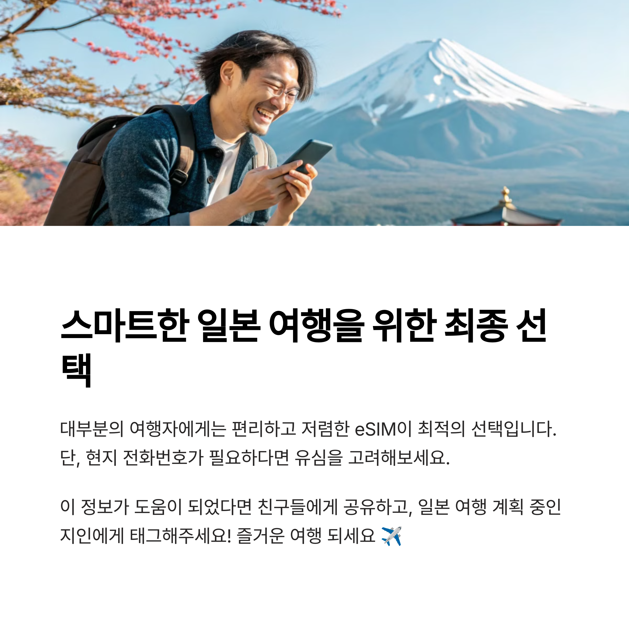 한국에서 미리 eSIM을 구매하고 설치해두면 일본에서 훨씬 여유롭고 저렴하게 여행을 즐길 수 있어요. 출국 전 최소 1~2일 전에는 설치까지 완료하는 걸 강력 추천드립니다. 각 업체 홈페이지에서 요금제, 호환 기종, 설치법, FAQ를 꼼꼼히 확인해보세요. 안전하고 즐거운 일본 여행 되세요! 감사합니다 :)